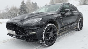 727 CV, V8 biturbo, zero ibrido. Aston Martin DBX S: il SUV più potente al mondo domina la neve. Eleganza nera e prestazioni brutali degne di James Bond.