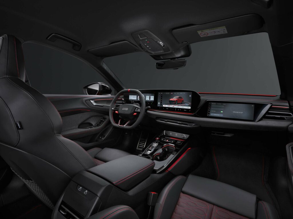 L’interno è dominato dall’Audi Digital Stage, che ingloba l’Audi virtual cockpit da 11,9 pollici, lo schermo MMI da 14,5 pollici e il monitor per il passeggero anteriore. Il cruscotto digitale prevede un layout RS specifico per monitorare tutti i dati più sensibili: temperature, pressioni degli pneumatici, forze G, regimi motore, tempi sul giro e potenza istantanea erogata.